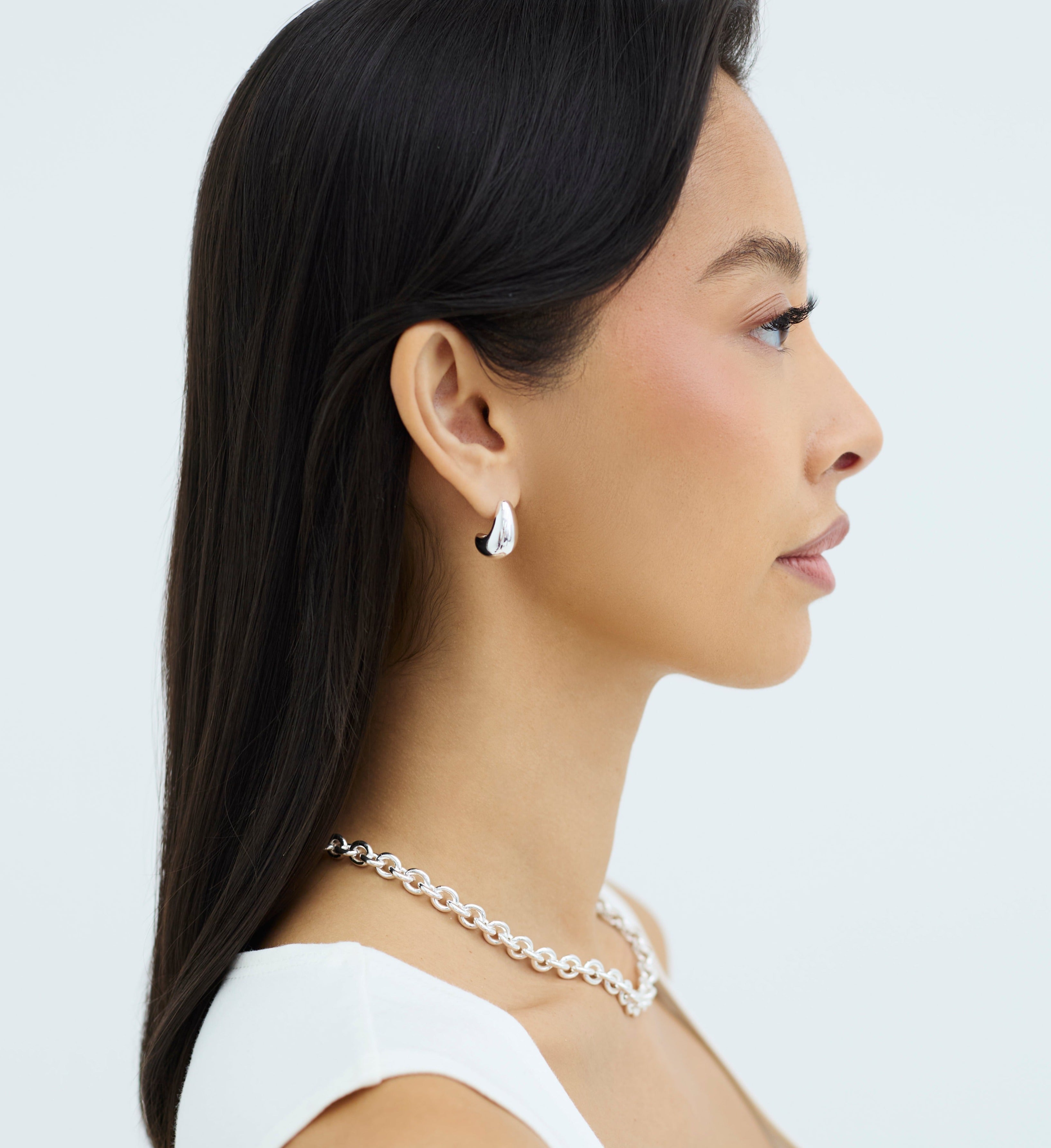 The Droplet Curve Earrings are the perfect go-to accessory to add a touch of vintage-inspired charm to any outfit. These effortlessly chic 18mm high-shine drop earrings are available in yellow gold or silver and our favourite way to wear them is by stacking both metals together double the impact and double the fun.