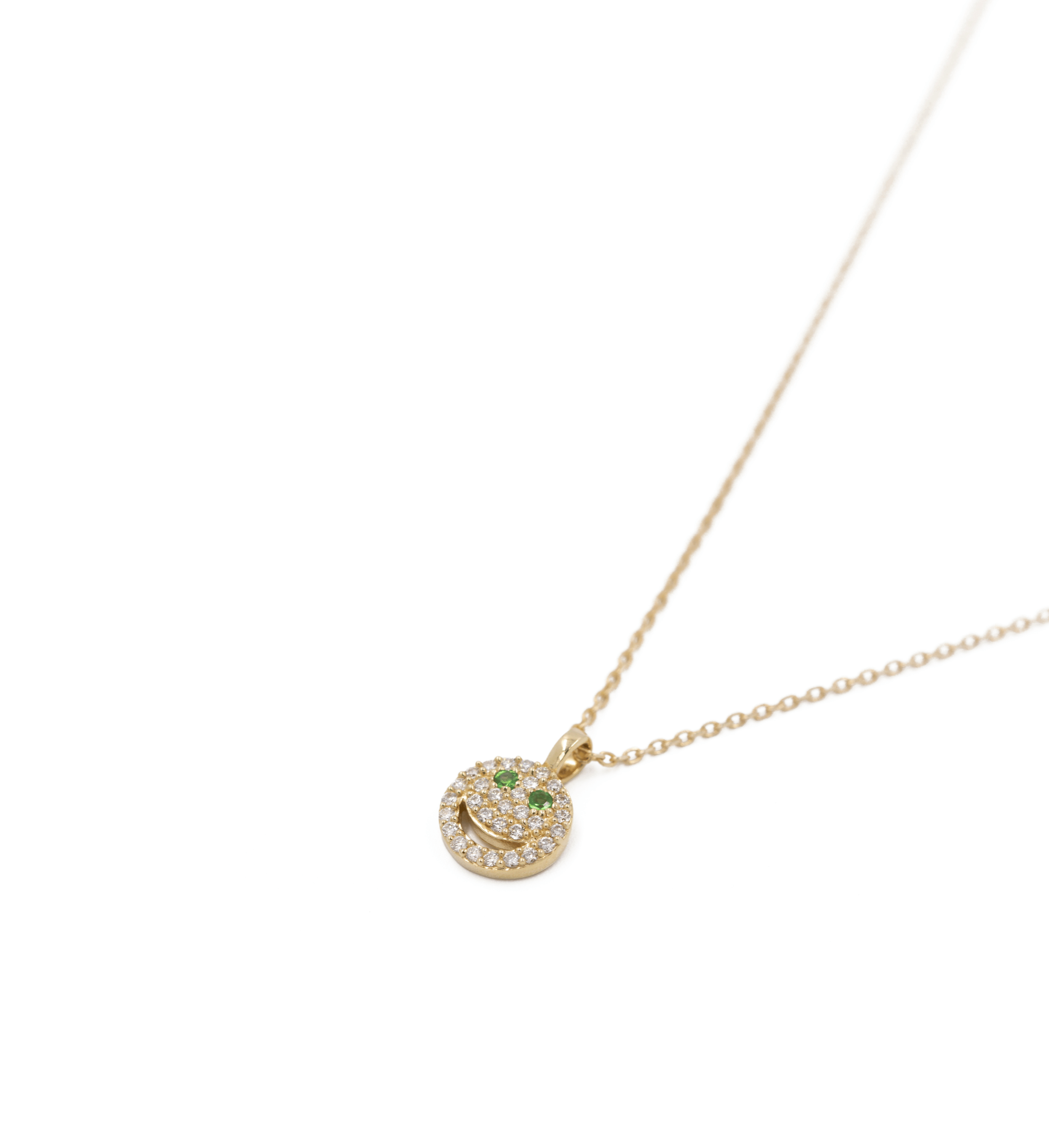 Crafted in 14K Yellow Gold, now available in your choice of Tsavorite or White Diamond eyes. Featuring a 16" diamond cut cable chain, this elevated happy essential makes for the perfect everyday piece. Wear it on it's own or pair it with our featured N007 for a layered look.