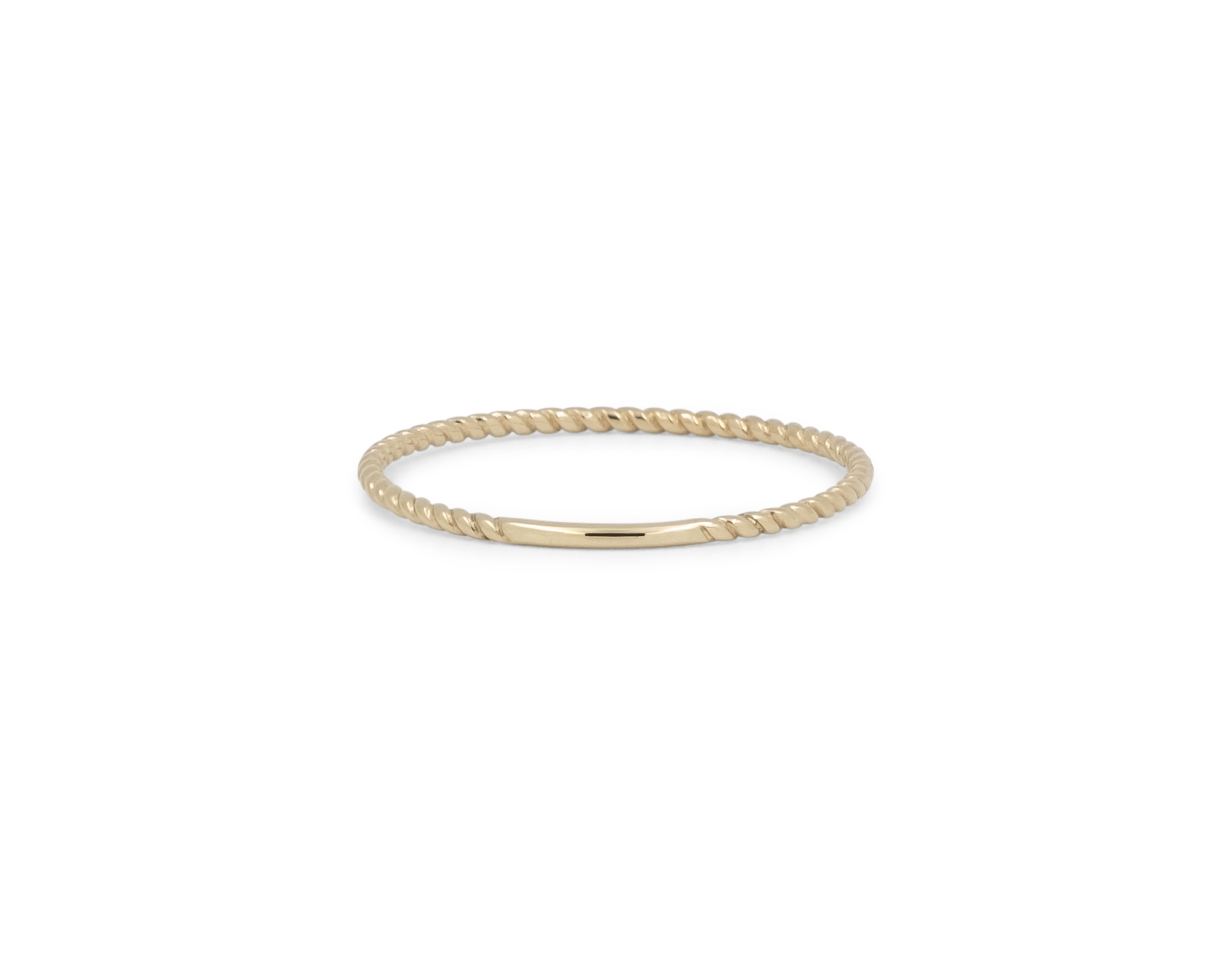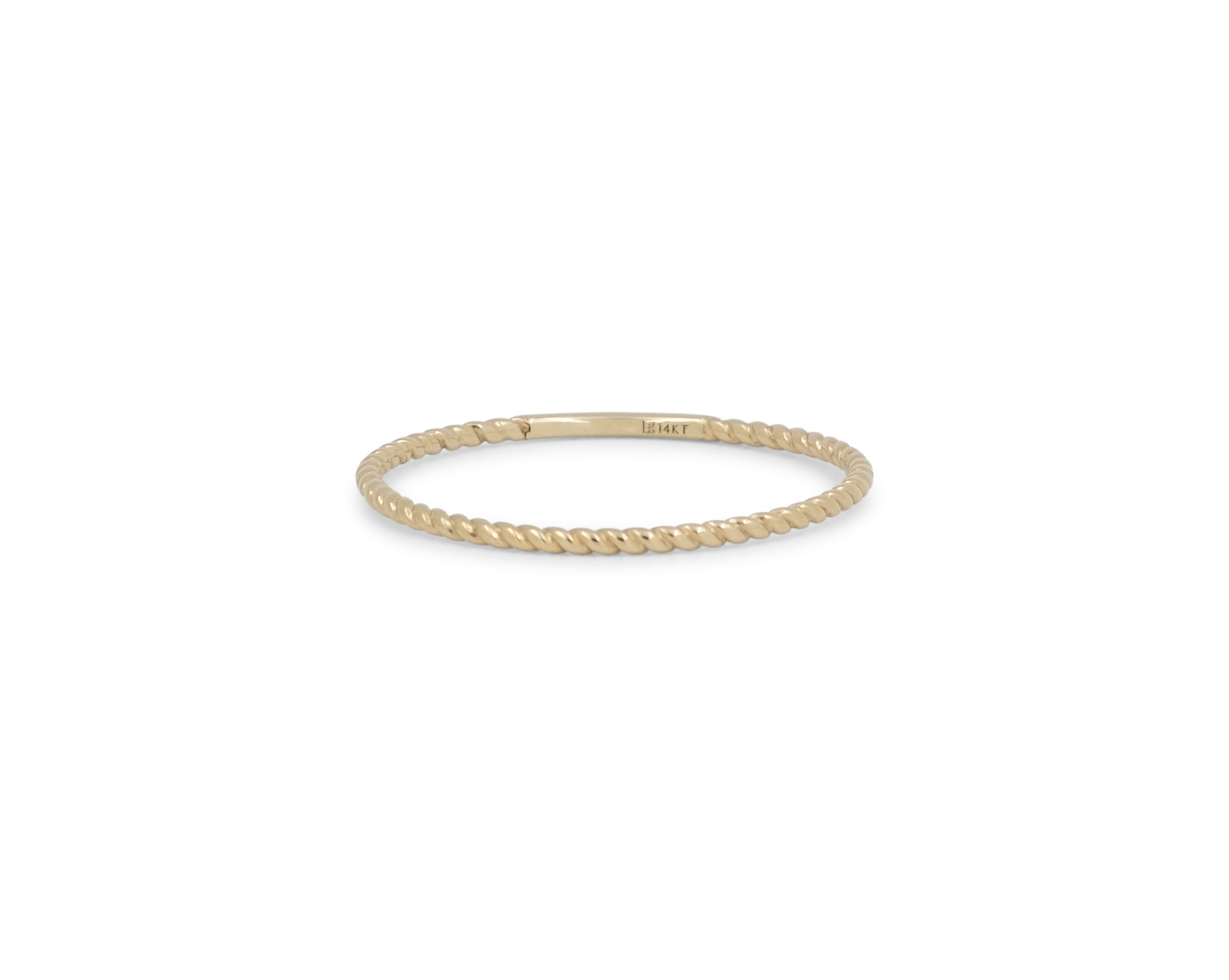 The 1mm Twisted Stacker is beautifully crafted in 14K yellow gold and is the perfect dainty ring to start or add to your collection. With its subtle twist, its simplistic and classic design makes it versatile to stack with. Stunning on its own, or layer and par it with The Single Diamond Stacker & The Dainty Signet Ring.ย