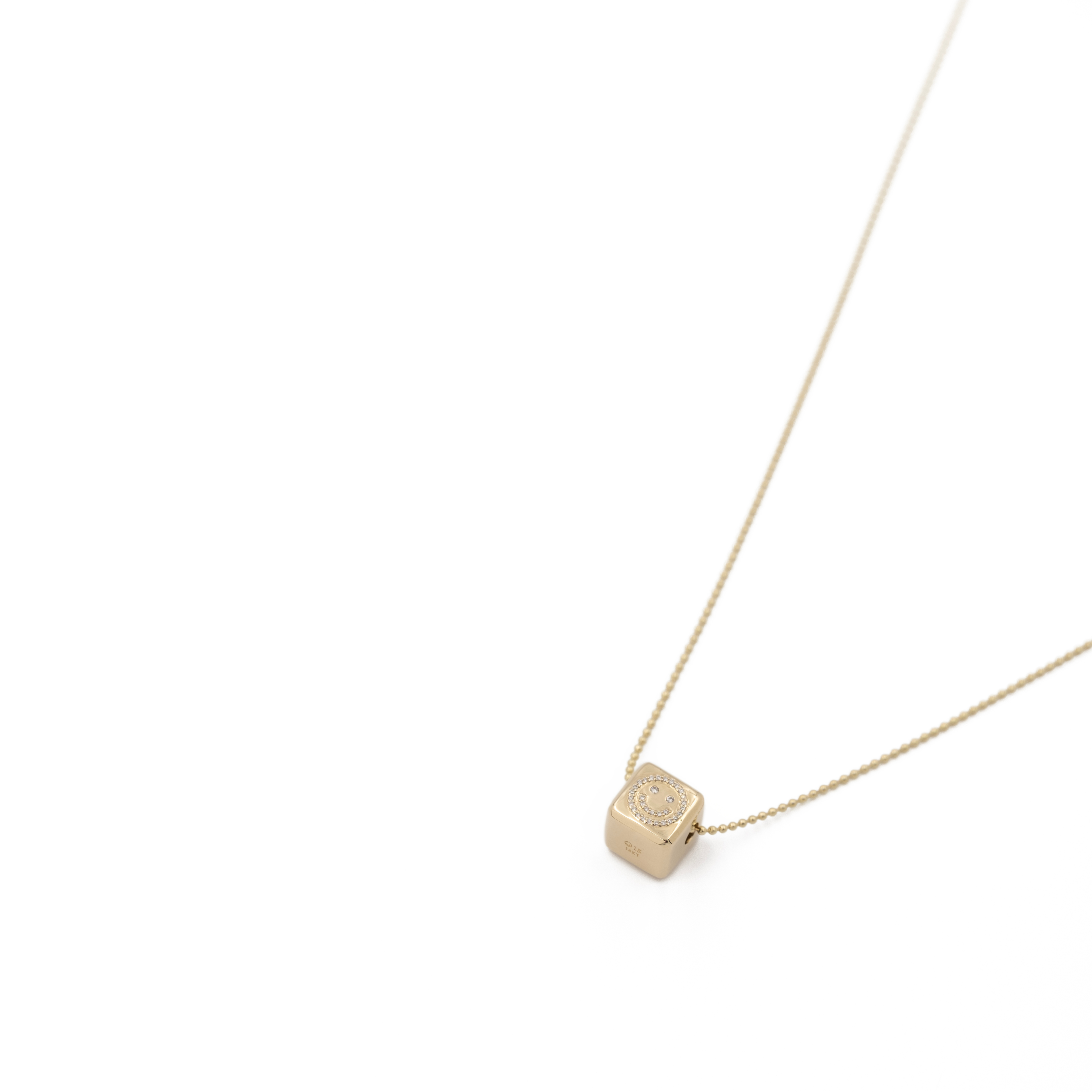 Meet The Happy Go Lucky Charmโ€” a hollow, 3-dimensional squared pendant, handcrafted in 14K Yellow Gold. Featuring a happy face-inspired design, shared claw set with full cut diamonds, this piece is perfect for those looking to add a smile to their everyday wardrobe.ย