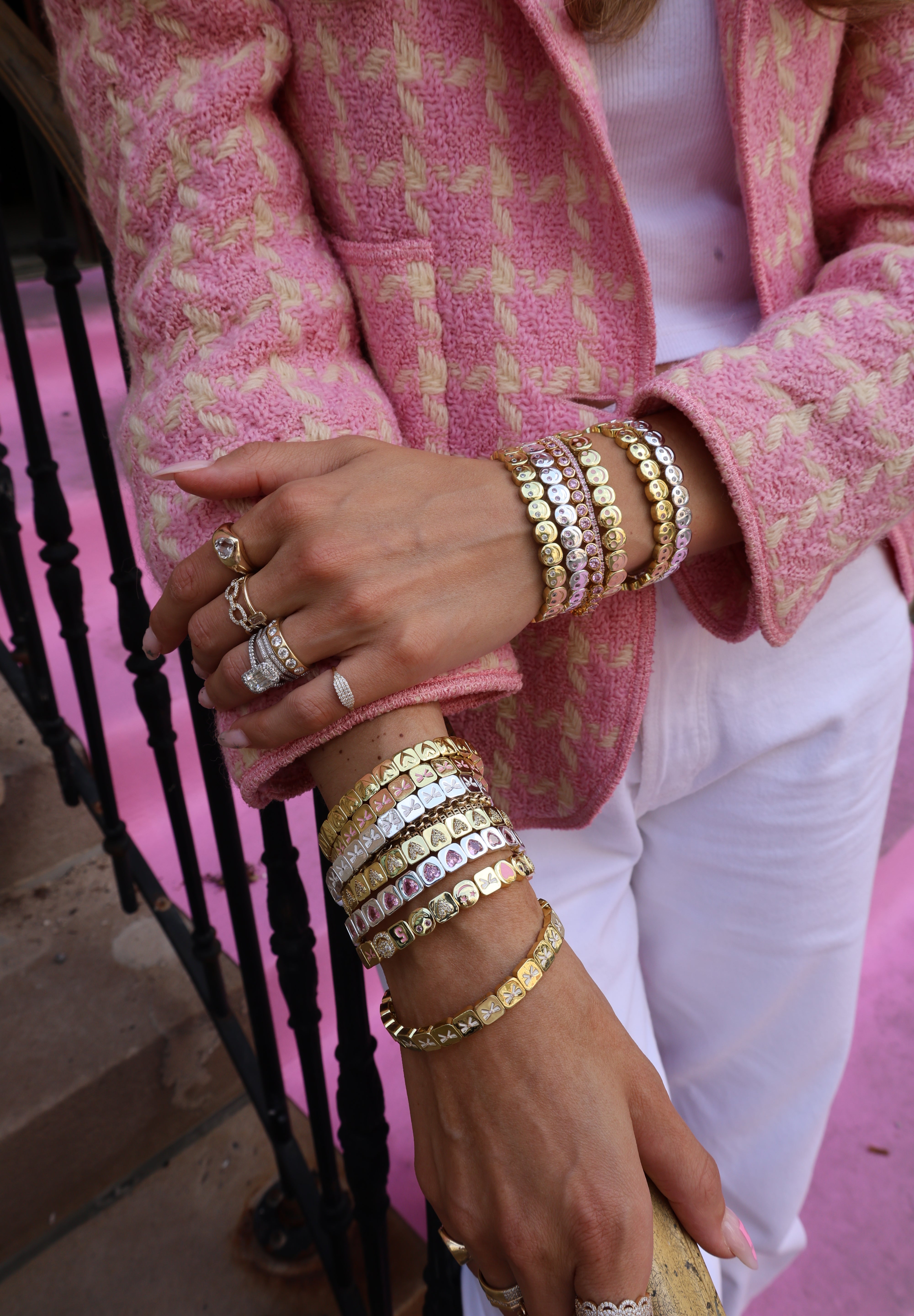 Introducing The Ivory Bow Bracelet! This adorable bracelet is a dream come true and features a white bow adorned on our classic square bead. Complete with a tiny pink gemstone in the centre for a subtle touch and available in your choice of yellow gold or silver. Stack it with other pieces in the dream collection or your other LG favs for a dreamy and charming statement.