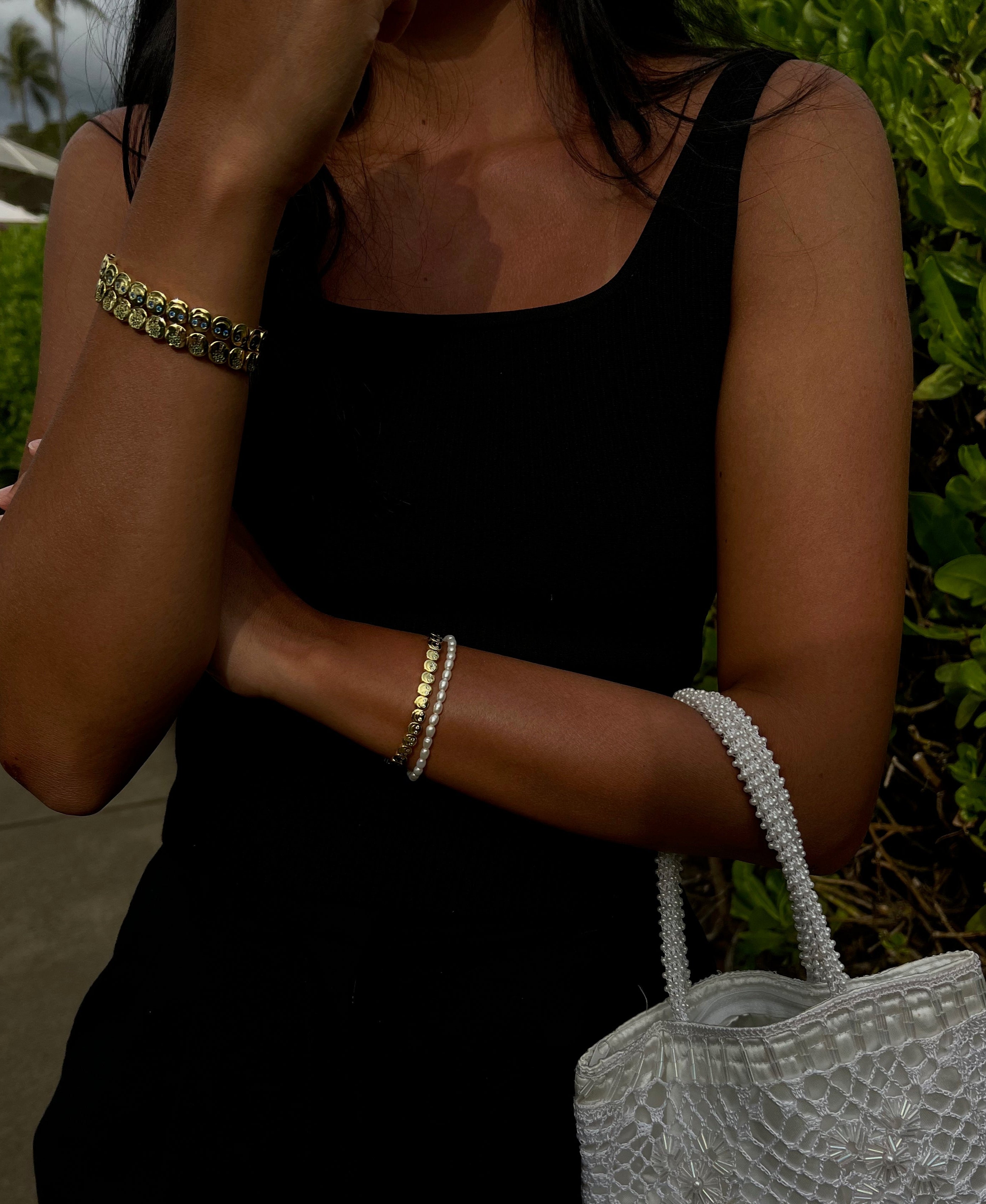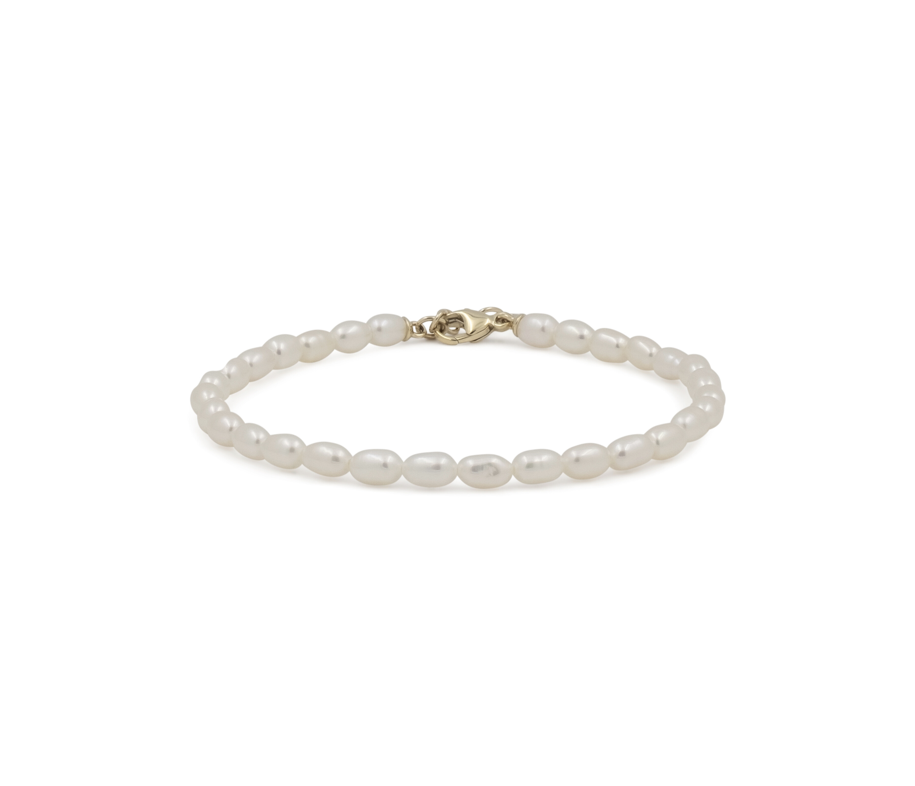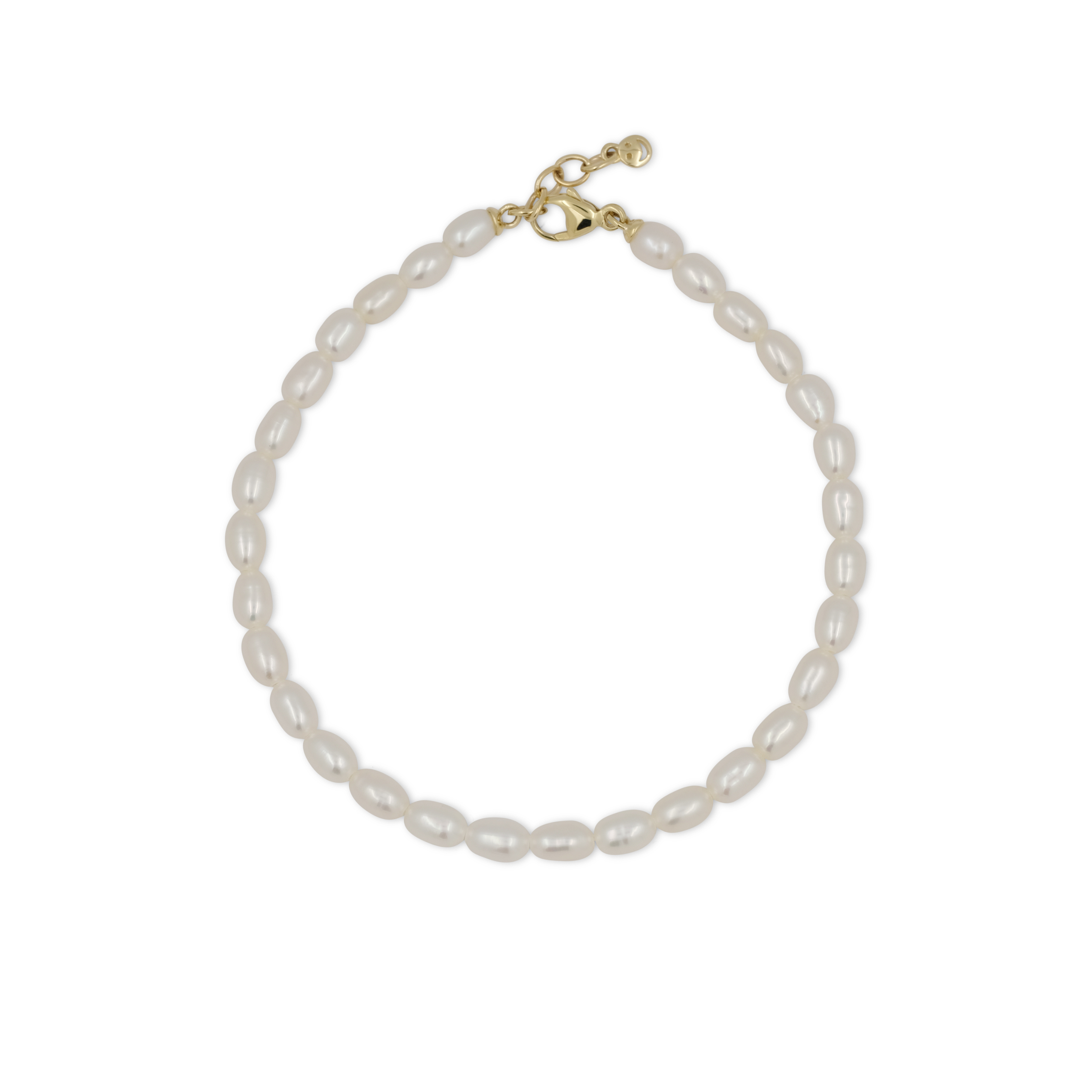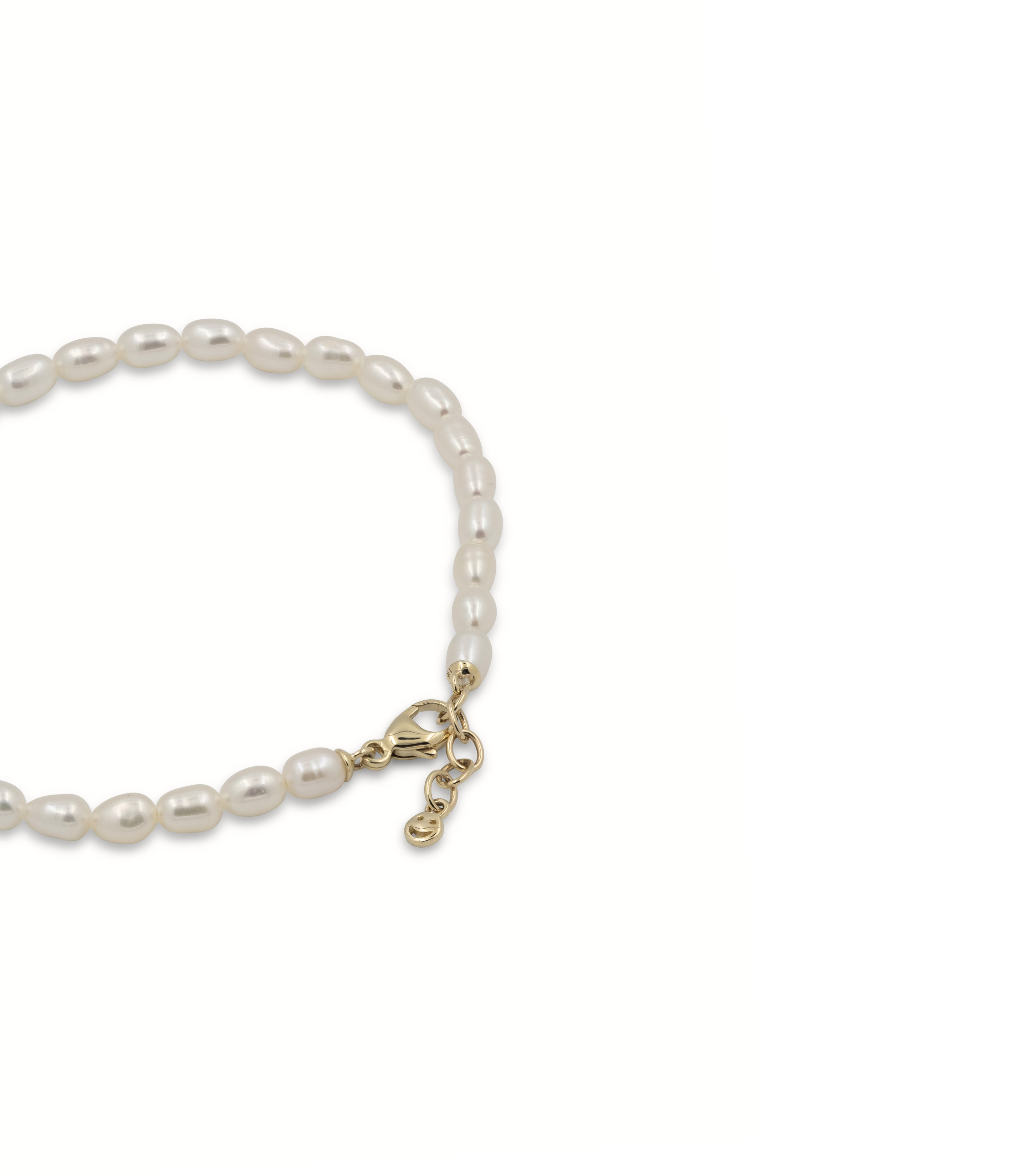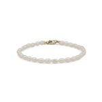 The Oval Pearl Bracelet features lustrous oval shaped pearls, perfectly subtle and dainty. Featuring a 10k yellow gold lobster clasp, a 3mm extender and complete with our signature happy face tag in 3mm.