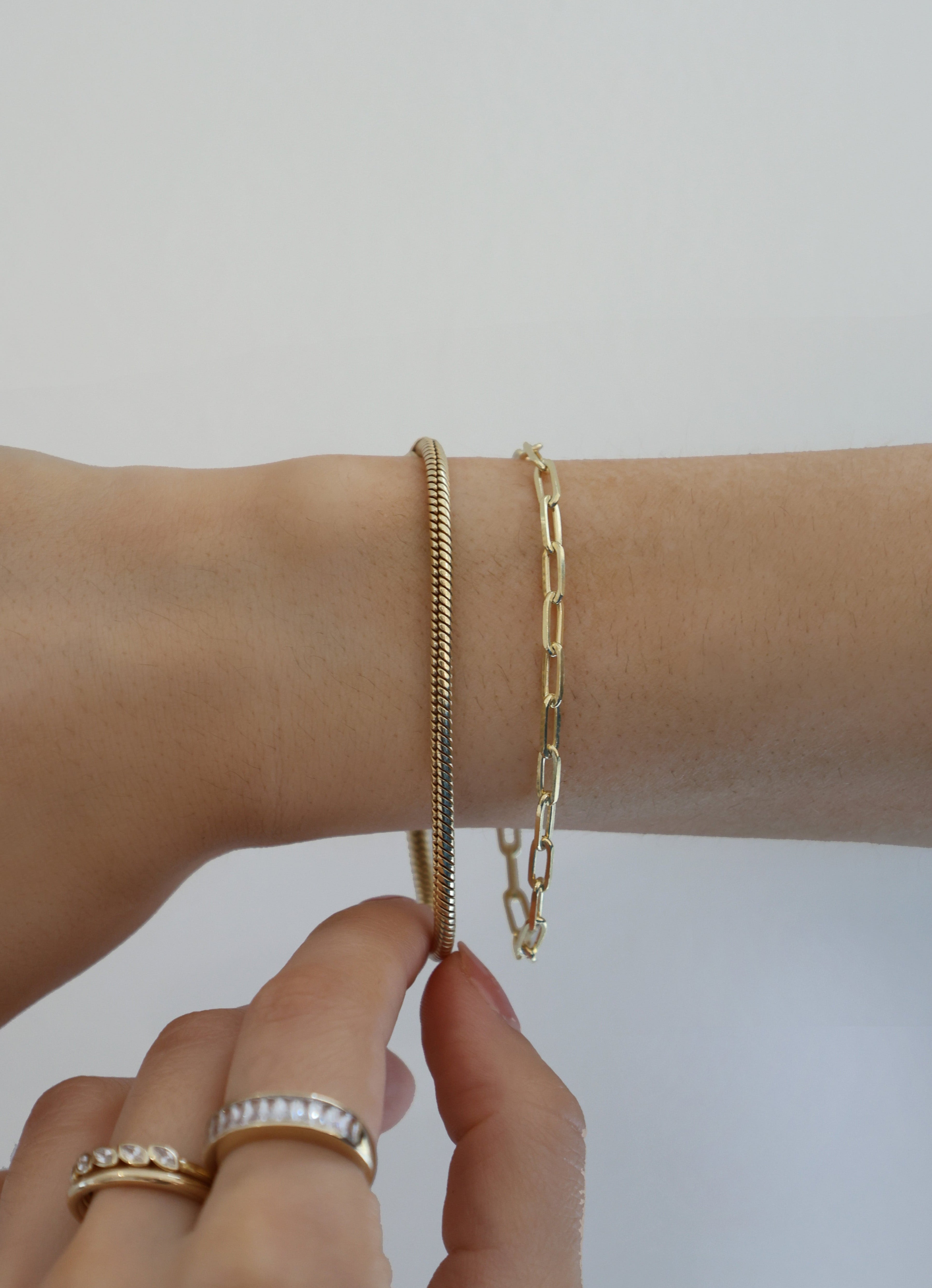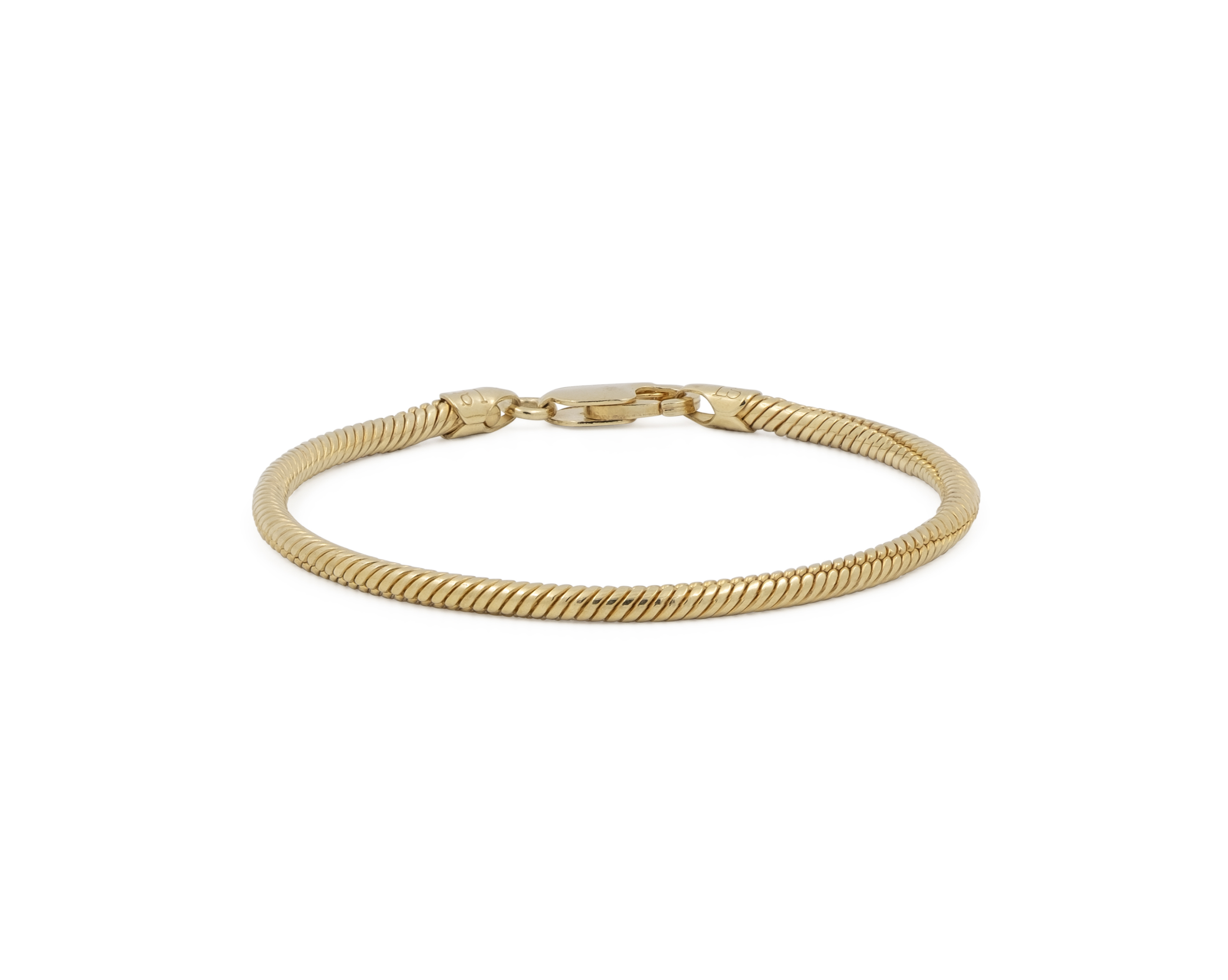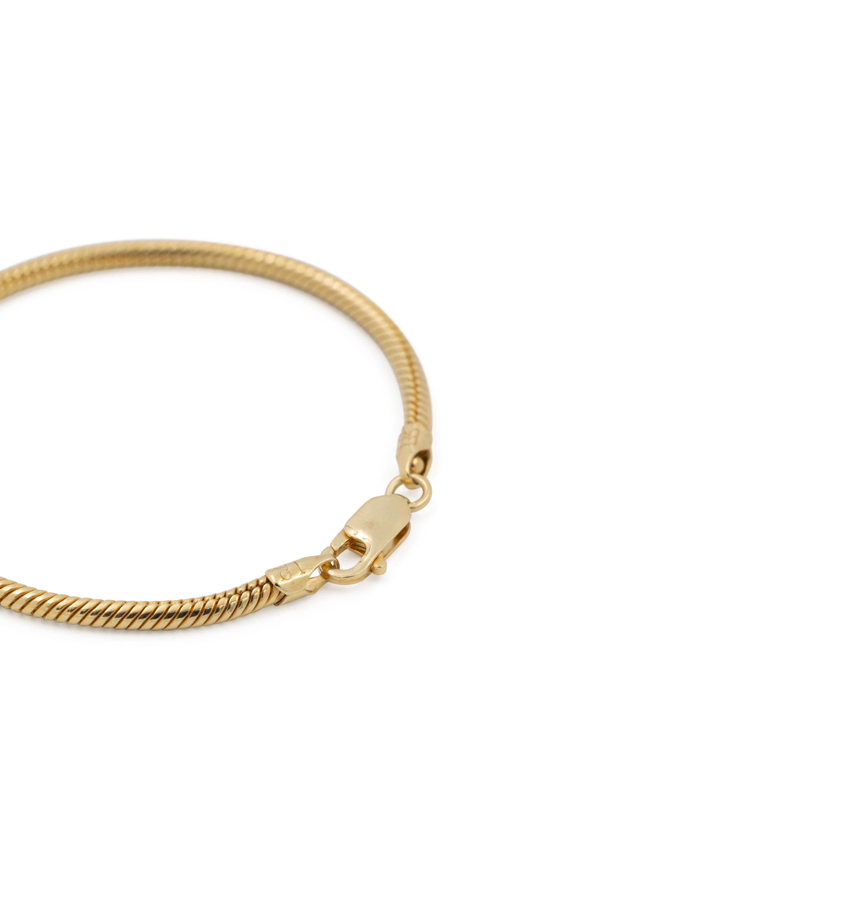 Meet your new favourite essential - The Snake Chain Bracelet is the effortless piece your stack has been missing. Crafted in 14K gold vermeil with a smooth, slinky 3mm width, it's perfect for layering and stacking or perfectly subtle on its own. Featuring a lobster clasp closure for a secure fit and comes in your choice of 7" or 8" lengths.