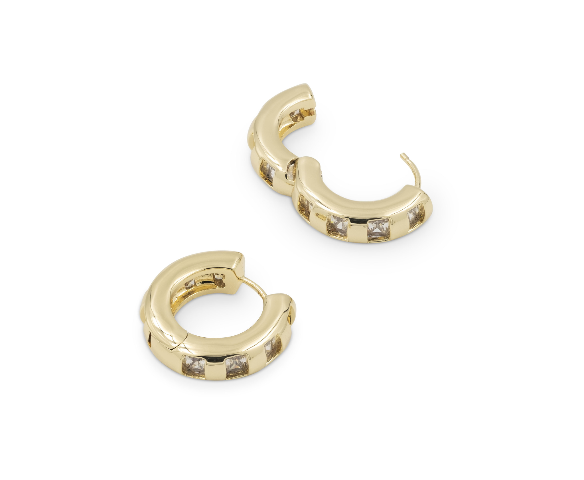 Sleek bezel-set CZ hoops in gold or silver. Lightweight, modern, and effortlessly elegant.
